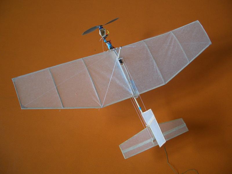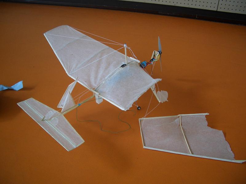ただし体育館を使用できるのは午後からなので、午前中はお世話になっているラジコン専門店に出向きます。 今回の目的はブラシレスモーターの下見。 今まで使っていたモーターがどうしても推力不足を解消できないのであれば、更に強力なモーターを使わざるを得ません。 ブラシレスモーターは交流電源を動力にしており、今まで使っていたモーターに比べて圧倒的に大きな力が発揮されます。 ただしブラシモーターに比べて重く、高回転になりやすいため小型低速機にやや向かない傾向があります。 それを動かすだけのバッテリーも大容量、大起電力のものになり、こちらも重量増を招きます。 それでもブラシレスモーターは魅力的で、それは推力だけでも機体を浮かすこが可能になります。 もし装備すれば、空中静止すら可能です。 ただし一番厳しいのはお金です。すべてそろえれば一万五千円を超えてしまいます。 やはり慎重にならざるをえません。 最適なブラシレスモーターの選定をするため、店員の方に十分な事情を説明しました。 すると、ラジコンの世界でも超軽量の飛行機を室内で飛行させることが、今、流行しているのだと教えてくれました。 更に150gから200g程度のラジコンを、アクロバットに飛ばしている動画も見せてもらいました。 そこで過去のコンクールに出場した飛行ロボットの写真を見てもらうと、とても考え方の古いものばかりだと言うのです。 それを聞いた私たちは、一気に室飛行ロボットの考え方が変わりました。 もう、バルサ材は古い。 最近のラジコン飛行機はデフロンやEEPなどの軽い素材を使用し、それをカーボンで補強するのだそうです。 そしてモーターはとてもパワフルなものを積み、軽量大推力であらゆる機動を可能にします。 そう言われて店内を見回してみれば、そう言った素材はいたる所に売られています。 デフロンはアメリカから輸入しないと手に入らないそうなので、店にあるEEPの説明を聞きました。 まずEEPとは軽いウレタンの様な物で、柔軟性があるためこれで主翼を作れば落ちても壊れません。 そのままでは柔らかすぎるので、カーボンを下面に貼り、縦通材の様な役割を担わせます。 あるいはカーボンの板を縦に差し込んで、縦通材の代わりにします。 これで曲げ合成があがるのです。 捩れにはカーボンをEEPの上面にトラス状に45度程度傾けて貼り付け、補強します。 いくら軽いとは言え、今のものとどちらがいいのか気になるところ。 EEP自体はそれほど高いものではなく、カーボンも今回で失敗しても再利用できるため、試しに買ってみました。 そんなこんなで遅刻して体育館に到着。 ♯13の主翼が運搬中に折れてしまうというトラブルがあったものの、すぐに修理できたので大きな影響は出ず。 きっと数ヶ月前の私たちならどうしていいのかわからず、狼狽していたところでしょう。 進化しているのは機体だけではないのです。 星野君と塚原君は♯13の微調整をし、その間に私と岡田君の二人ででEEPとカーボンを使った新構造の主翼を試作します。 買ってきたカーボンは一辺2ミリの角材二本です。 それを主翼大の矩形に切ったEEPの前縁と後縁に、テープで貼り付けて桁とします。 リブはいざと言う時のために大量生産してあったため、それを使用します。 上半角は翼端同士を糸で張る事でつけました。 かなり簡単に作ることができます。 早速重量を量ろうにも、量りを体育館に持ってきていません。 既存の主翼(♯7の主翼)とEEP製の主翼を棒に垂らし、天秤にします。 二つが釣り合った点はEEP製の主翼寄り……。 つまりEEP製の主翼の方が重い! EEPの厚みが大きかったこともあるのかもしれません。 軽量化が出来なかった事は残念でしたが、苦労して作った主翼方が性能がいいということが証明されると、その反面うれしくも思います。 しかしカーボンの方はとても細く柔軟性があるため、今後は今の構造のまま桁だけをカーボン製にしてみたいです。 さて♯13の方は、相変わらず離陸が出来ません。 ギアの改造のおかげで迎え角が取れ、多少は浮き上がります。 しかし地面効果が途切れると上昇できなくなってしまいます。 あと一割でも推力があれば飛ぶことが出来たかもしれません。 でも後一割の推力がどうにもならない……。 この時、私たちは決心しました。 ブラシレスモーターを買おうと……。 体育館を予定よりも少し早く片付け、ラジコン専門店へと出向きます。 片道一時間近い道のりを一日に二往復もするなんて、私たちの行動力って素晴らしいと思います。 八方塞で仕方がない状況なので、仕方のないことです。 たくさんのモーターが並ぶ中で、特に小型のブラシレスモーターは三つ。 一つは最軽量ながら、回転数は非常に高く極小直径プロペラしか回すことが出来ないので向きません。 そこからブラシレスモーターの選択肢は二つ。 一つは16グラム、でやはり高回転数で小直径のプロペラを付けなくてならないもの。 見合った